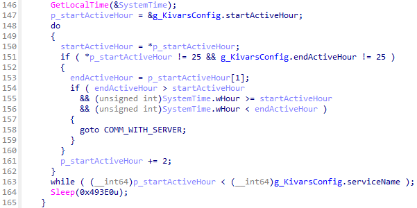 また、今回調査した検体ではいずれも使用していないようですが、Kivarsには設定情報で定められた時間にしかC2サーバと通信を行わない機能も存在します。このような機能は標的型攻撃で使用されるマルウェアでよく見られるものであり、企業の端末やサーバから業務時間外に通信が発生することで存在を検知されることを防ぐ狙いがあると考えられます。