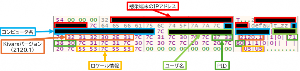初回通信時、Kivarsは感染端末の情報や自身のバージョン情報をC2サーバに送信します。