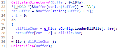 の処理において、Kivarsは自身に関連するファイルがシステムディレクトリ下に存在すると断定して、ファイルの削除処理を実行しています。このことから、少なくとも今回の調査で解析した検体については、Kivarsは侵害したコンピュータの特権を取得後に使用されていたものと考えられます。