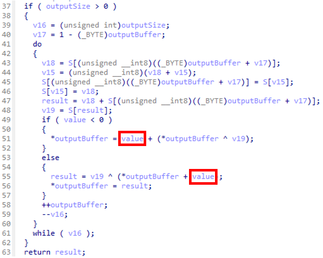 です。通信の暗号化・復号時でもカスタマイズされたRC4アルゴリズムに関する関数が呼び出されますが、前述したパラメータ value