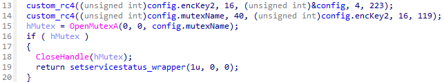 設定情報にはKivarsローダが参照する情報のほか、Kivars本体の通信先や永続化のためのサービス名といった情報も含まれていますが、この段階ではそれらの情報は復号されず、後述するミューテックス名等だけが復号されます。