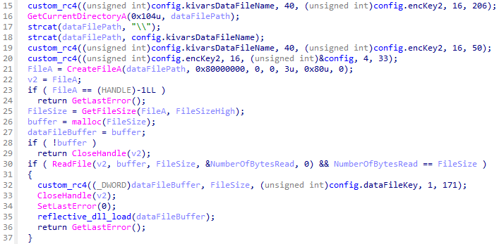 最後に、図1のデータファイル (暗号化されたKivars本体のDLLファイル) を復号してロードします。このファイルは前述の設定情報と同様に、カスタマイズされたRC4アルゴリズムによって暗号化されています。