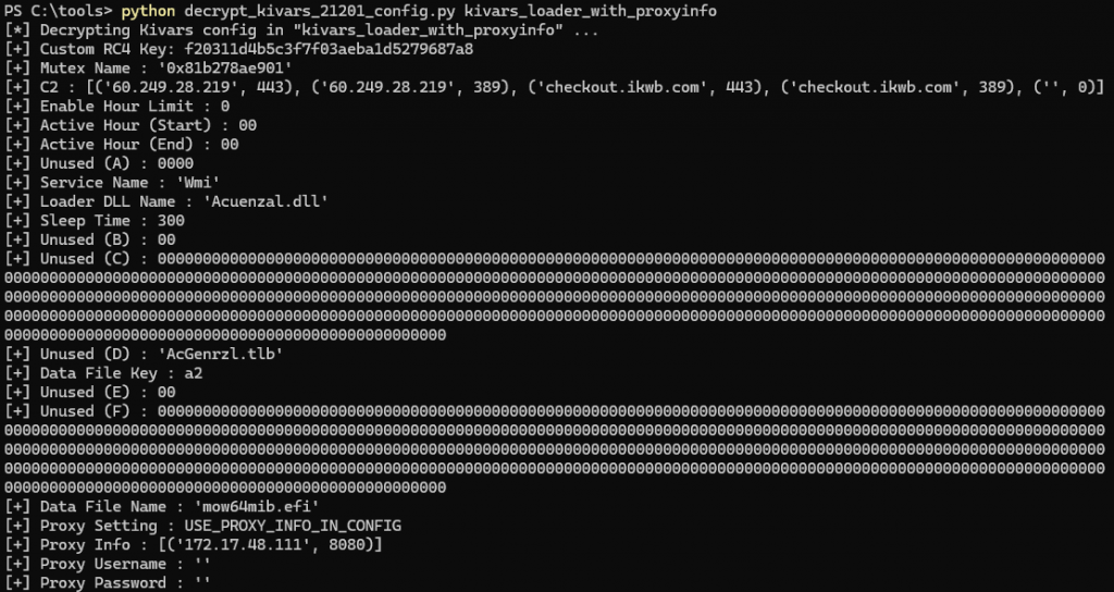 本ツールは今回の調査で解析した検体 (バージョン2120.1) のみを対象としており、これ以外のバージョンの設定情報は抽出できません。これはKivarsのバージョンごとに、設定情報の暗号化方式・構造・サイズなどが大きく異なるためです。
