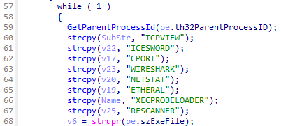 Kivars本体が実行されると、まず実行中のプロセスを列挙して解析ツールが実行されていないか確認します。