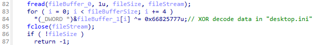 シェルコードローダ msedgeupdate.dll が実行されると、まず多重実行を抑制するためにMutex Global\MicrosoftEdgeUpdate を作成します。その後、同じフォルダ内に存在する desktop.ini ファイルを読み込み、その内容を 0x66825777 でXORデコードすることでシェルコード (SNOWLIGHT) を取得します。