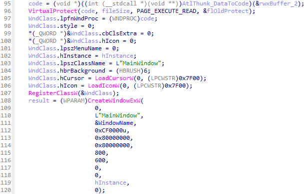 最後に、実行可能メモリ領域上に配置したシェルコード (SNOWLIGHT) を新たに作成するウィンドウ MainWindow のウィンドウプロシージャ関数として実行します。