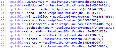 SNOWLIGHTが実行されると、まずAPI Hashing3によるWindows API関数アドレスの動的解決を行います。モジュール名およびWindows API関数名はROR13ベースのアルゴリズムでハッシュ化されていました。