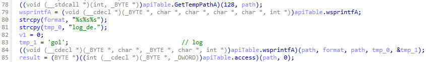 その後、 GetTempPathA 関数を呼び出して取得した一時ファイル用のフォルダ内にファイル log_de.log が存在するかどうか確認して、存在する場合はマルウェアの実行を終了します。なお、Linux版SNOWLIGHTにも同様にファイル /tmp/log_de.log の存在を確認するコードが存在します。