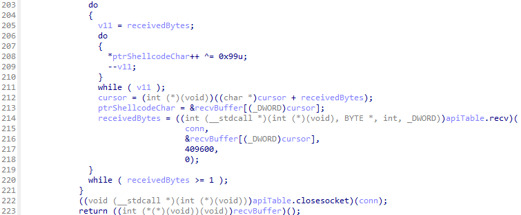 最後に、受信したHTTPレスポンスのボディ部分を 0x99 でXORデコードして実行します。