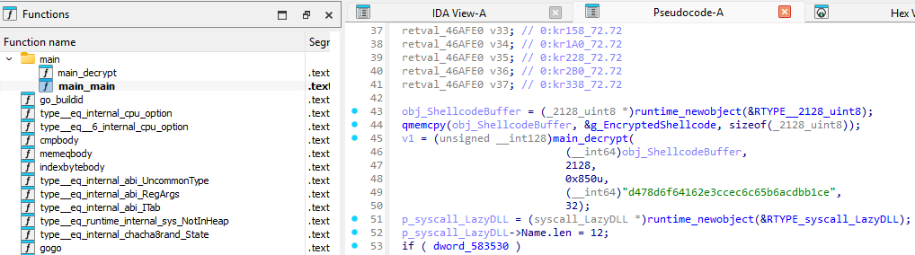 この実行ファイルはGoで開発されたシンプルなシェルコードローダで、AES-GCMで暗号化されたシェルコードをメモリ上で復号して、 EnumWindows API関数を悪用してシェルコードを実行する機能を持ちます。実行するシェルコードはWindows x64版 SNOWSHELLであり、今回取り上げた検体と同様にVShellをC2サーバからダウンロードして実行する機能を持ちます。