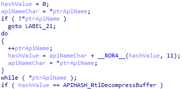 シェルコードが実行されると、まず図2のようにROR11ベースのアルゴリズムを使ったAPI Hashingによって GetProcAddress, LoadLibraryA, VirtualAlloc, memcpy, RtlDecompressBuffer といったWindows API関数のアドレスを動的解決します3。