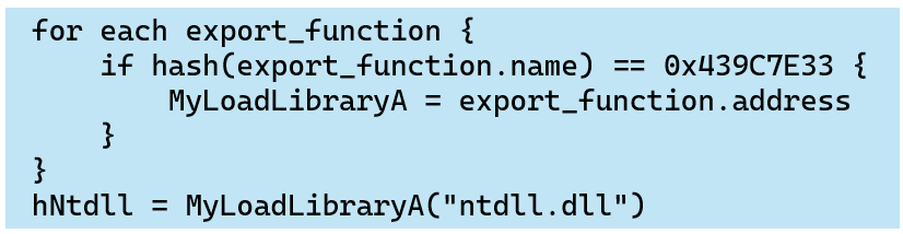 In the following procedure, loader calls the Windows API functions that have been dynamically resolved using API hashing. API hashing dynamically resolves the address of an API function from a hashed function name and DLL name, generated using a chosen algorithm.