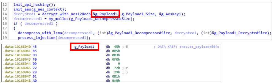 The payloads to be executed by the loader are stored within it, but it is LZMA compressed and AES-128-ECB encrypted. After creating persistence setting, loader will decrypt and decompress payloads to execute them.