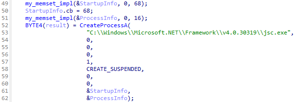 Once payloads are decrypted and decompressed, loader calls CreateProcessA function to create C:\Windows\Microsoft.NET\Framework\v4.0.30319\jsc.exe process in a suspended state.