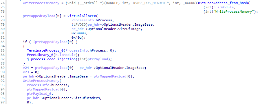 After that, the loader writes the payloads to virtual memory of created process using VirtualAllocEx and WriteProcessMemory function.