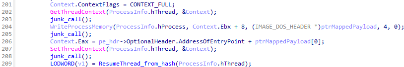 Finally, the loader calls functions such as SetThreadContext and ResumeThread to execute payloads in context of created process.