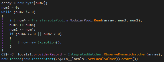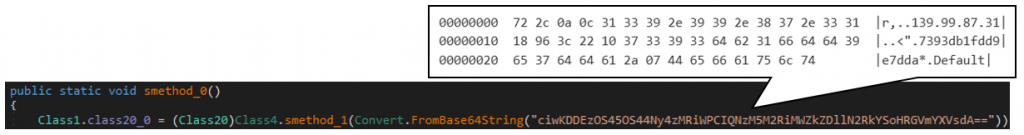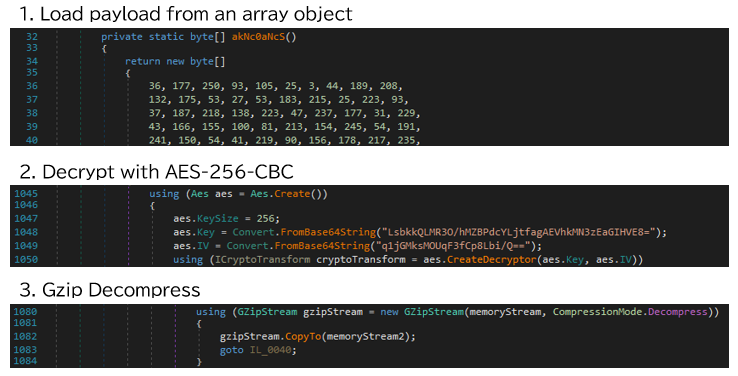 The payloads injected into jsc.exe were simple loaders developed using .NET Framework. In that loader, next-stage payload (TorNet or PureHVNC) is stored in AES-256-CBC encrypted and GZip compressed format within an array object.