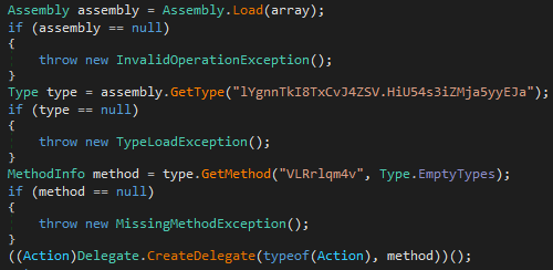 Decrypted and decompressed payload will be loaded and executed using Assembly.Load and Delegate.CreateDelegate function.