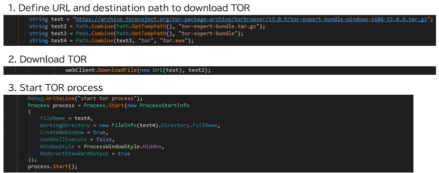 Next, TorNet will check whether the running system is a sandbox environment3. After that, TorNet will download TOR to temporary folder and execute it.