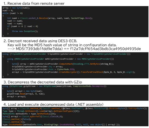 TOR will host SOCKS proxy on port 9050 to allow applications to communicate via the TOR network. TorNet will use this SOCKS proxy to communicate with remote server and receive .NET assembly that is DES3-ECB encrypted, and GZip compressed. After decrypting and decompressing the payload, TorNet will load the received .NET assembly.