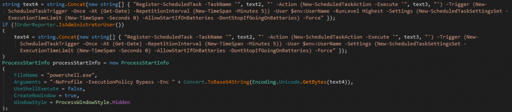 Next, depending on hardcoded parameter, PureHVNC will create persistence setting. This is done by registering scheduled task via PowerShell, but in this case, the feature was disabled, probably because the persistence setting had been implemented at the first stage loader.