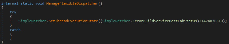 PureHVNC will also call SetThreadExecutionState function with argument 0x80000003 (ES_CONTINUOUS | ES_DISPLAY_REQUIRED | ES_SYSTEM_REQUIRED) depending on the hardcoded parameter. In this case, the feature was also disabled, but it likely exists to prevent the machine from entering sleep mode.