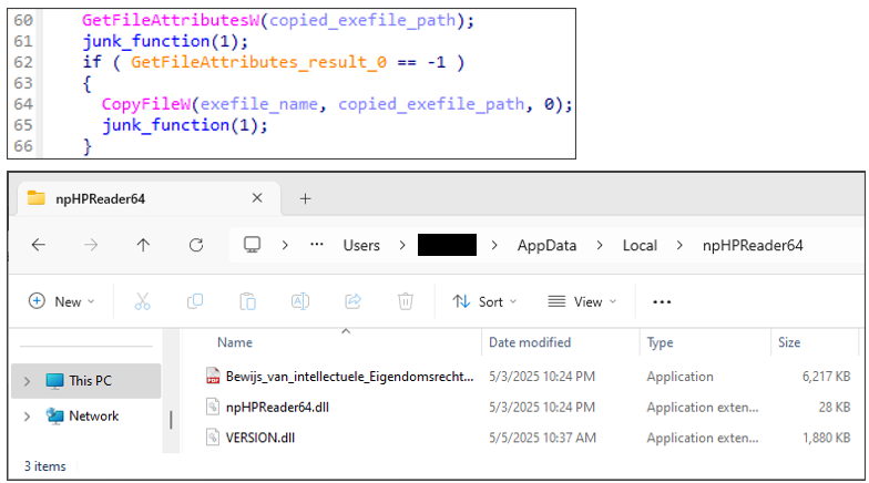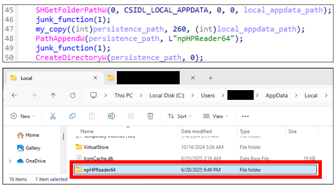 Once the loader is executed, it registers the automatic execution setting in the registry to achieve malware persistence2. First, it creates a npHPReader64 folder under the %LOCALAPPDATA% folder.