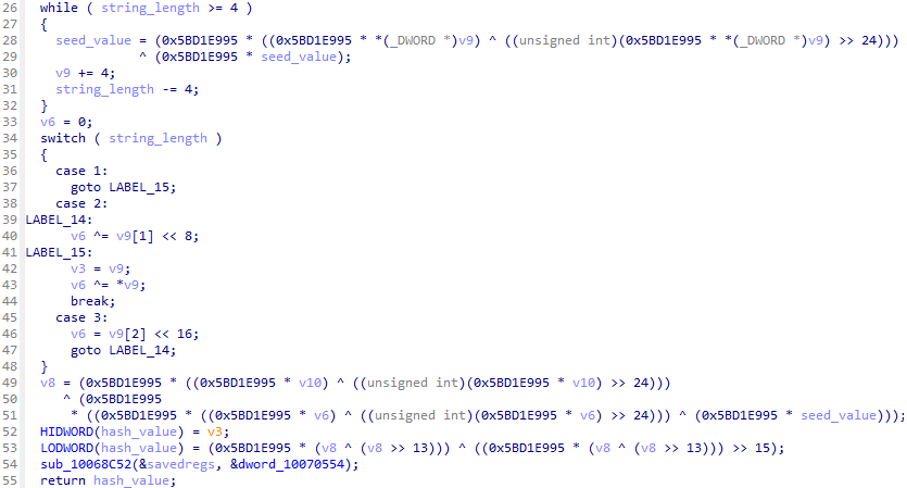 This loader uses an algorithm called MurmurHash2, with seed value 0xB801FCDA, to hash API function and DLL file name. API hashing using MurmurHash2 is also implemented in well-known infostealer malware “LummaStealer”, but its implementation in this type of loader had not been observed before.