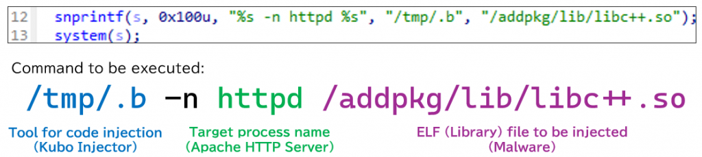 Next, dropper will execute them using system function. Kubo Injector allows to specify target process name in -n to inject the payload. In this case, httpd (Apache Web Server) was specified to inject the payload.