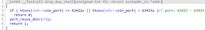 Hook function will check if source port is from 63423 to 63433 , than treat it as communication from attacker.