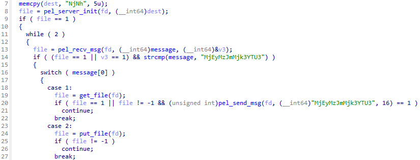 Upon further investigation of this implementation, we confirmed the existence of a very similar implementation in the another TINYSHELL-based malware irad , which is used by UNC3886 (Figure 8). Whereas the malware in this case returns the string MjEyMzJmMjk3YTU3 as a response, irad returns the string ek63a21km7WSWkfk .